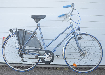 Mi trabajo con la bicicleta se limitó a desmontarla, adecentar las partes más dañadas, sustituir las de desgaste frecuente y ponerla a punto. Aparentemente poco, pero llevó bastante trabajo. La bicicleta es una Batavus de tipo femenino relativamente “moderna”, pienso que, por el tipo de cuadro, de los años ochenta del siglo XX. La bicicleta tiene el típico equipamiento holandés habitual: pantallas para que las faldas no se enreden con los radios de la rueda trasera, guardabarros, trasportín trasero (con la característica goma de fábrica), luces de dinamo (sin funcionar) y un segmento del guardabarros trasero pintando en blanco. También pata de cabra y, genuinamente holandés, un candado de serie de “llave de contacto” que bloquea la rueda trasera cuando quitas la llave.